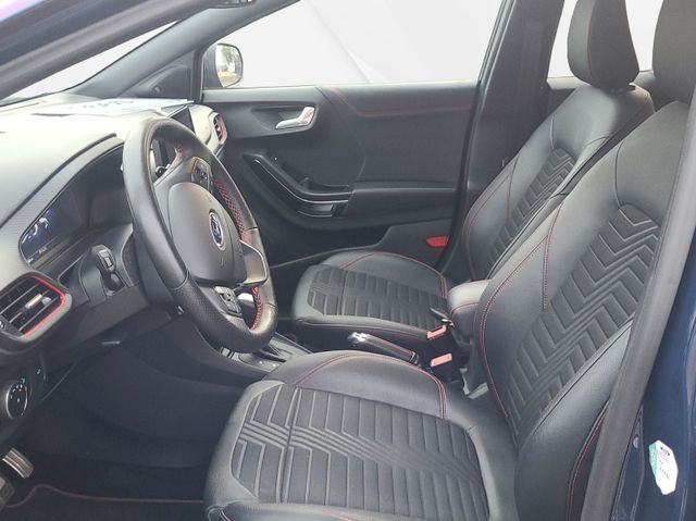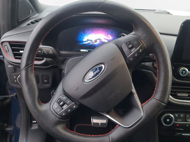 Ambiente-Beleuchtung vorn (LED), Antischlupfregelung (ASR), Audio-Navigationssystem Ford mit AppLink, Außenspiegel elektr. anklappbar, Außenspiegel elektr. verstell- und heizbar, Body-Styling-Paket, Dachhimmel Stoff, dunkel, Eco-Anzeige für verbrauchsoptimiertes Fahren (EcoCoach), Einparkhilfe hinten, Fahrassistenz-System: Berganfahr-Assistent (Hill-Holder), Fahrassistenz-System: Falschfahrer-Warnfunktion, Fahrassistenz-System: Fernlichtassistent (Scheinwerfer mit Abblendautomatik), Fahrassistenz-System: Notbrems-Assistent, Fahrassistenz-System: Post-Collision-System, Fahrassistenz-System: Pre-Collision-System, Fahrassistenz-System: Spurhalteassistent mit Müdigkeitserkennungs-Sensor, Fahrassistenz-System: Verkehrsschildassistent, Farbdisplay für Bordcomputer, Fensterheber elektrisch vorn + hinten mit Komfortschließung, FordPass Connect inkl. eCall, Fußmatten Teppich, Getriebe 7-Gang - Doppelkupplungsgetriebe, Heckleuchten LED, Innenraumfilter: Staub- und Pollenfilter, Intelligent Protection System (IPS), Intelligenter Geschwindigkeits-Begrenzer, Isofix-Aufnahmen für Kindersitz, Karosserie: 5-türig, Kombiinstrument Digitalanzeige 12,3 Zoll, Komfort-Paket, Kopfstützen hinten mechan. verstellbar (3 Stück), Lackierung Blazer-Blau uni, Laderaumboden variabel (Ford Megabox), Lendenwirbelstütze vorn, Lenkrad (Sport/Leder, ST), Lenkrad mit Schaltwippen, Lenksäule (Lenkrad) höhen-/längsverstellbar, Mild-Hybrid 92 kW (Motor 1,0 Ltr. - 92 kW EcoBoost), My Key (2. Fahrzeugschlüssel programmierbar), Nebelscheinwerfer LED, Otto-Partikelfilter (OPF), Pedale Aluminium, Radstand 2588 mm, Reifen-Reparaturkit, Reifendruck-Kontrollsystem, Rücksitzlehne geteilt/klappbar (60:40), Schadstoffarm nach Abgasnorm Euro 6d, Scheinwerfer-Assistent mit Tag-/Nachtsensor, Sitzbezug / Polsterung: Kunstleder, Sitze vorn höhenverstellbar, Sonnenblende links mit Spiegel (beleuchtet), Sonnenblende rechts mit Spiegel (beleuchtet), Sport-Fahrwerk, Sportsitze vorn, Standard Variante, Start/Stop-Anlage, Türgriffe außen Wagenfarbe, Verglasung hinten abgedunkelt (Privacy Glass)
